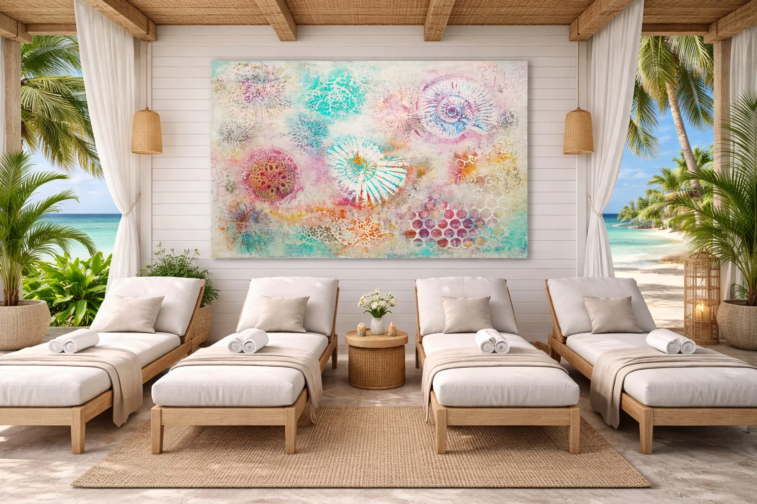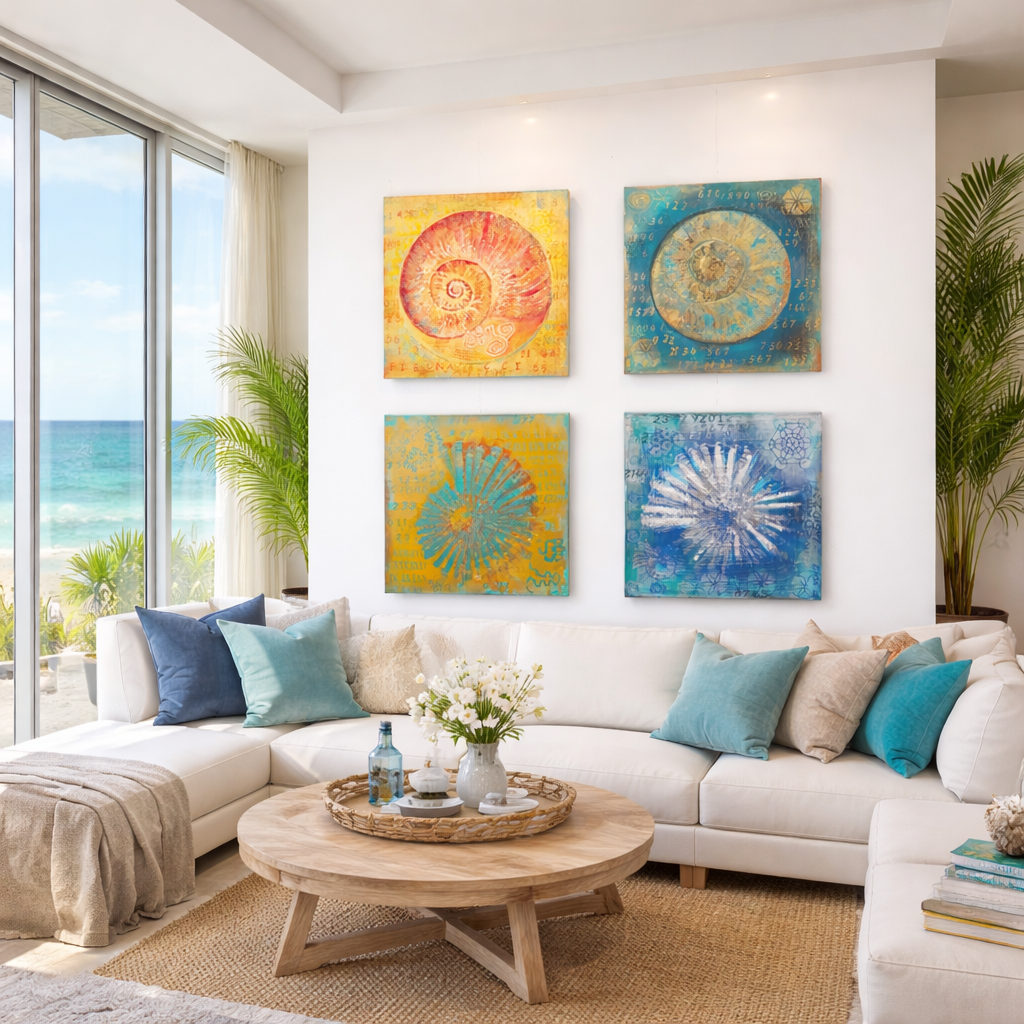 Through layered textures, coastal pigments, and spiral compositions, Beach DNA transforms shells, sand, and sea into contemporary artworks that embody balance, movement, and natural perfection.
